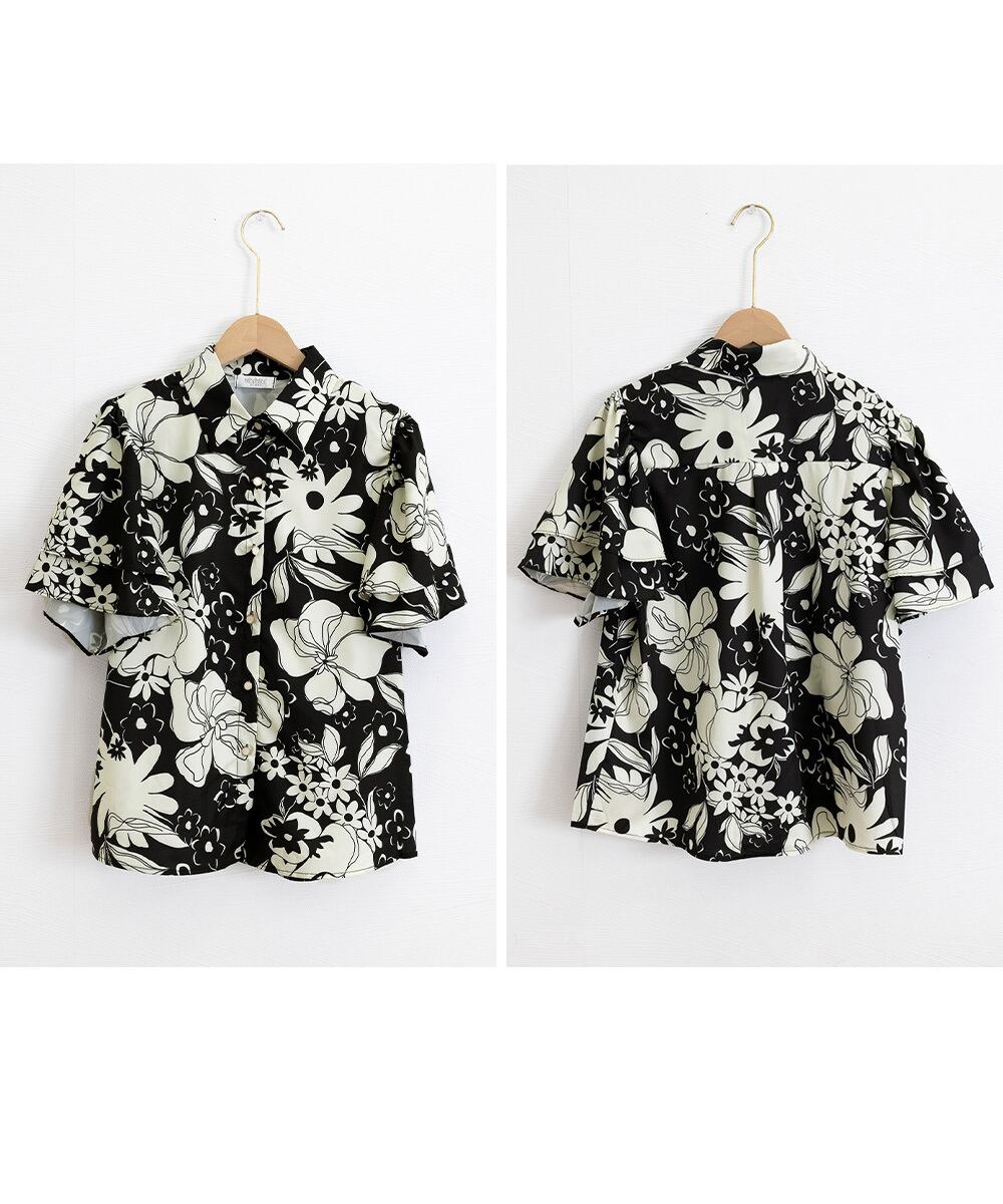 二重仕立てのフレアスリーブが印象的な総柄ブラウス。