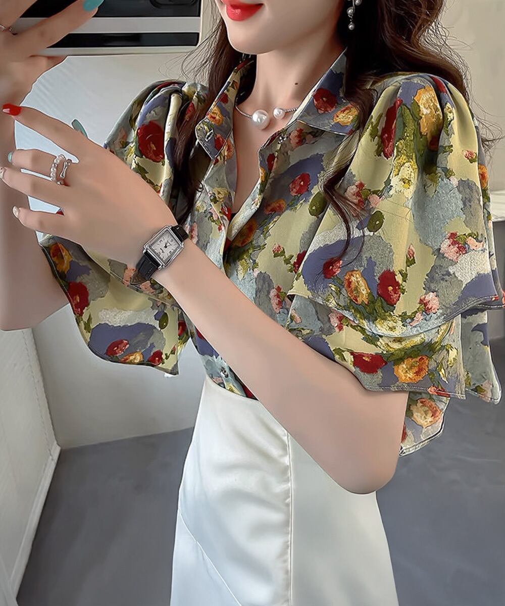 レディース ゆったり シャツブラウス 着やせ 花柄シャツ ドレープ袖 ボタニカル柄フリルブラウス 大人女性抜け感 韓国風