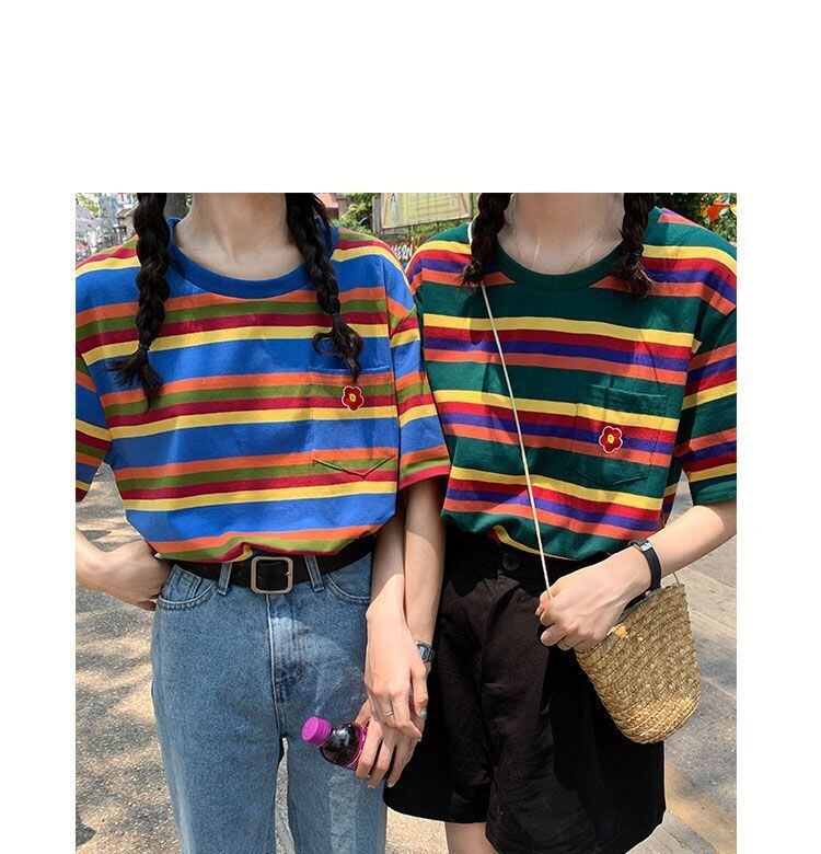 T シャツ レディース レインボー Tシャツ ボーダー柄 ゆるTシャツ シルエット 5分袖 ゆったり カジュアル