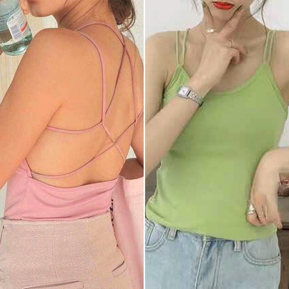 シンプルながらもおしゃれなバッククロスストラップの背中見せキャミソール