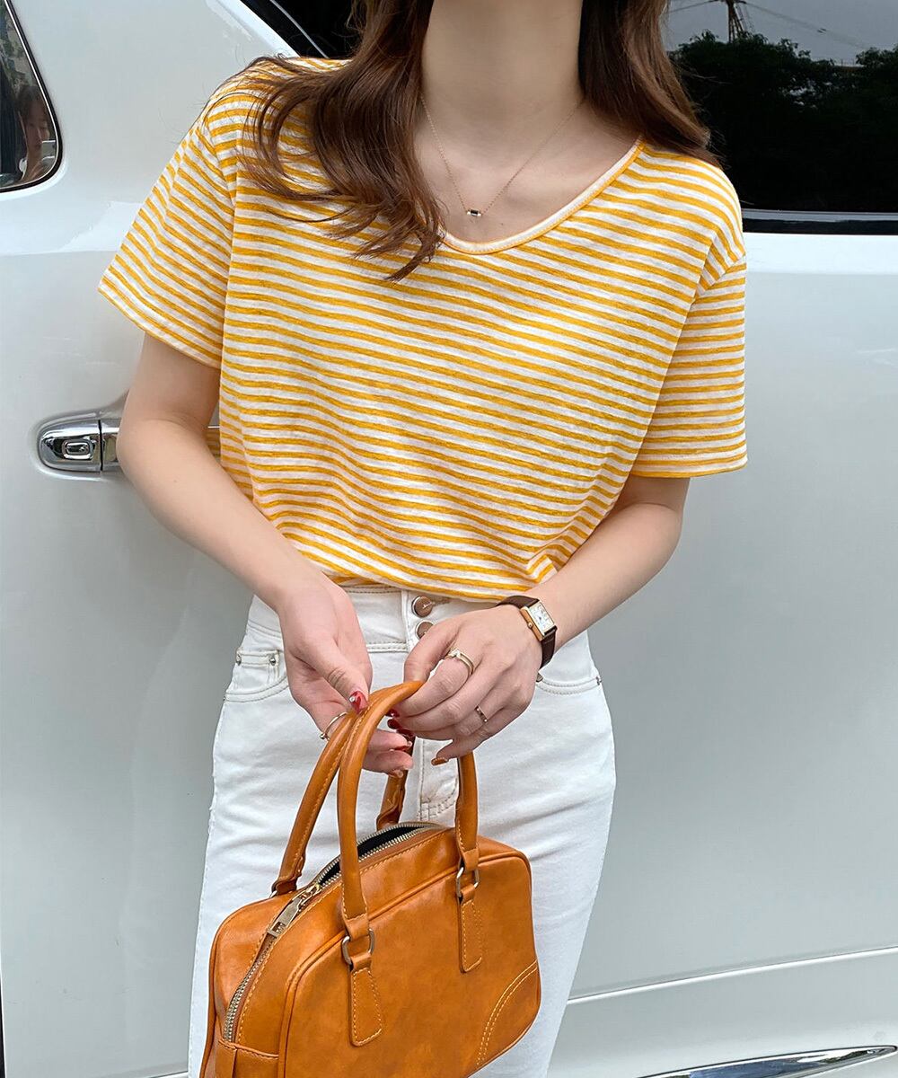 デコルテをきれいに見せるVネックと、気分が上がる鮮やかなボーダー柄がポイント。