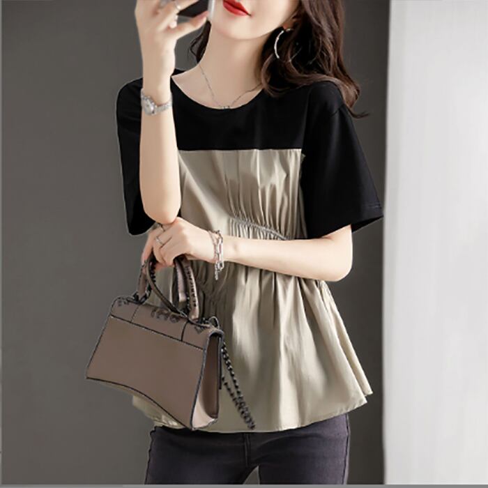 クルーネック tシャツ ブラウス ギャザー 配色 異素材 切り替え カジュアル 半袖 体型カバー