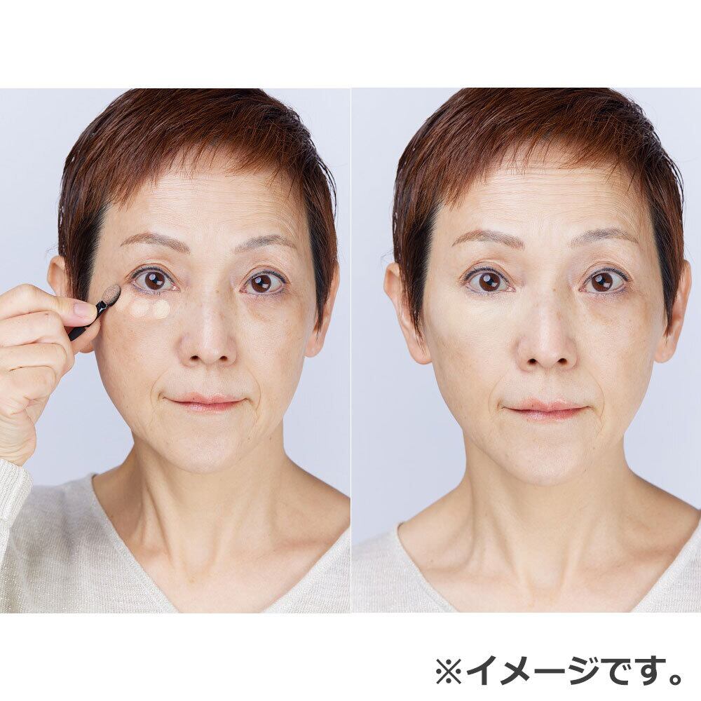 (1)左側のオレンジを付属チップ(大)にとり、クマやくすみの気になる部分に塗布し、軽くたたき込むようにのばします。目尻や目の際の細かい部分には、チップ(小)をお使いください。