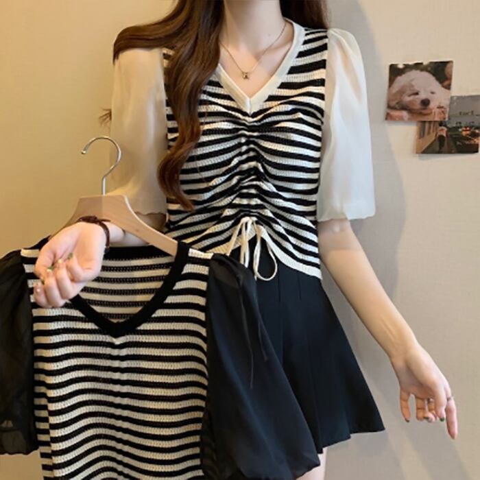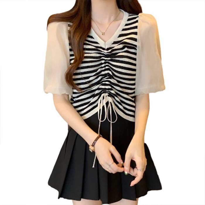 レディース ボーダー柄 ニットトップス 可愛い袖 切り替え Vネック フリル