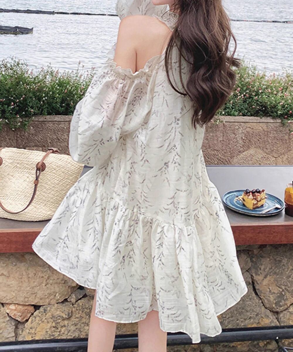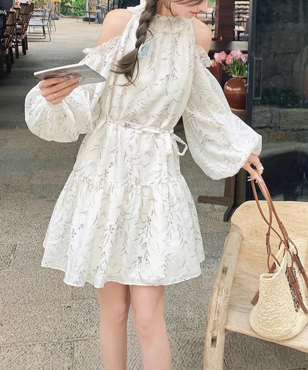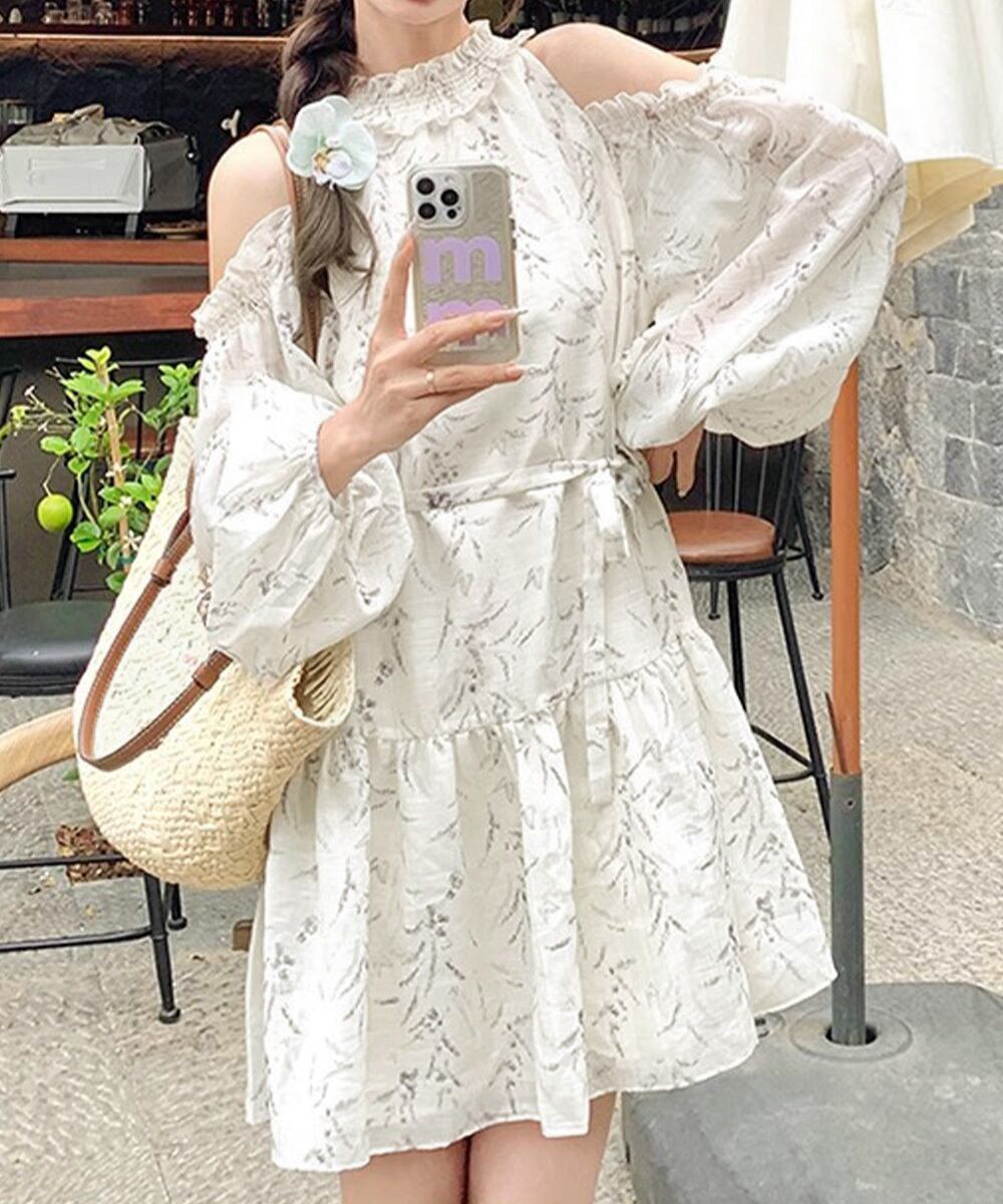 肩を大胆に見せるオフショルダーデザインの花柄ミニワンピース。