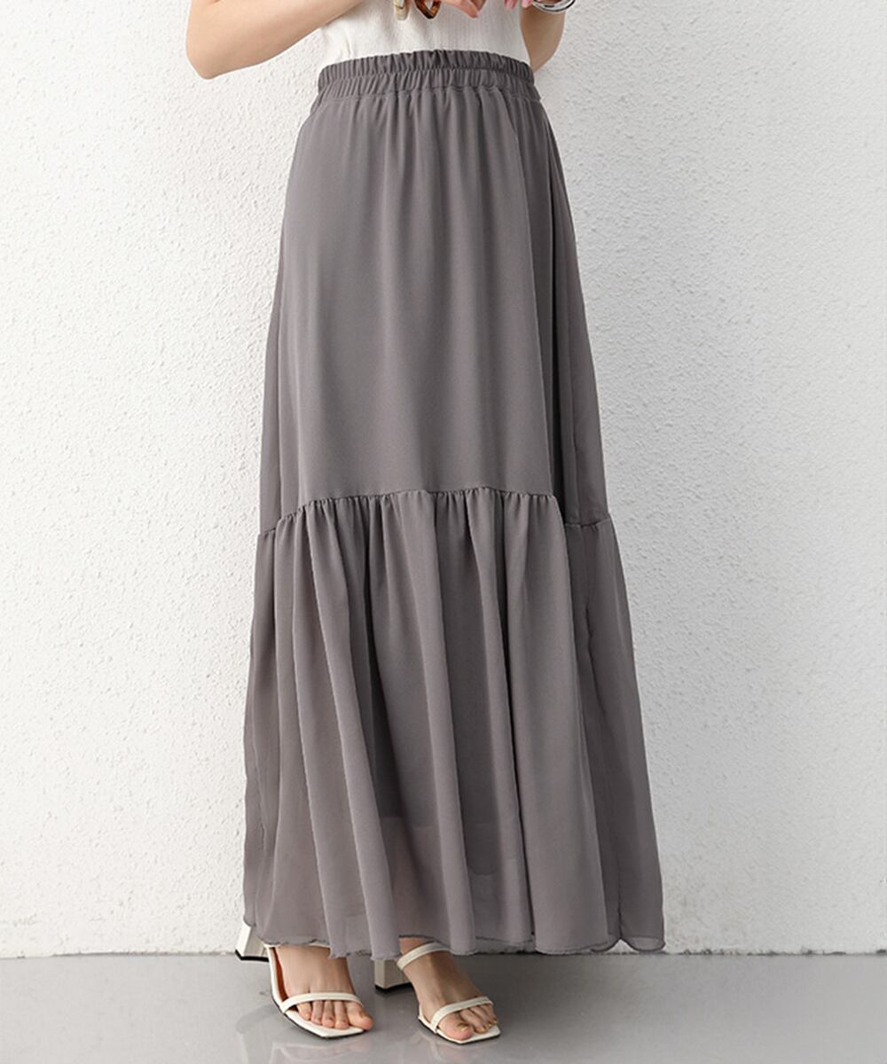 エアリーなシフォン素材が、女性らしさを引き立てるティアードスカート。