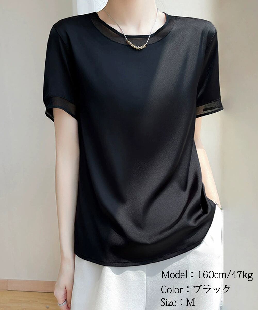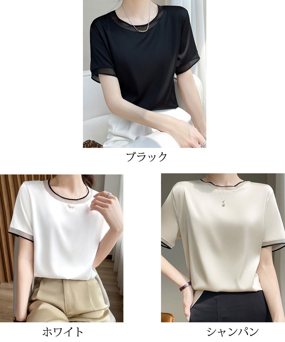 【日本倉庫即納】 クルーネック サテン風シャツブラウス