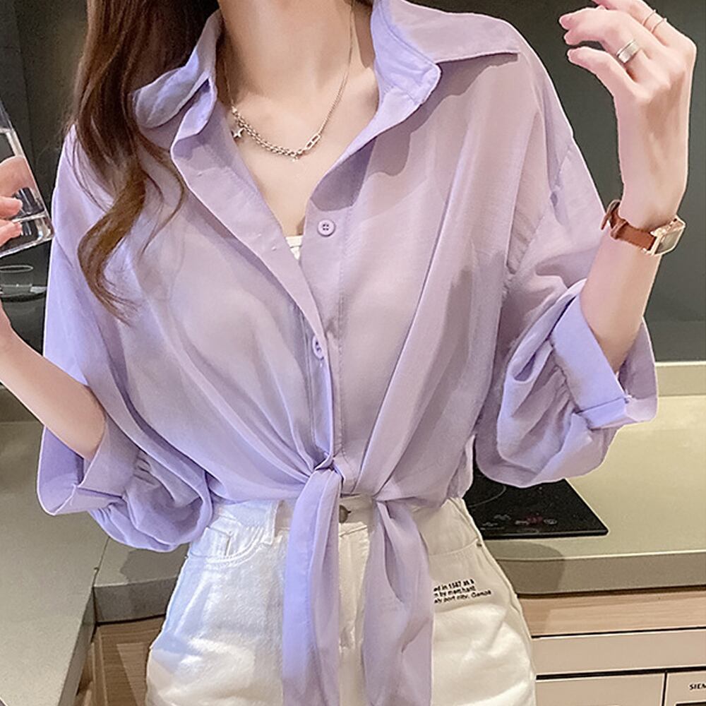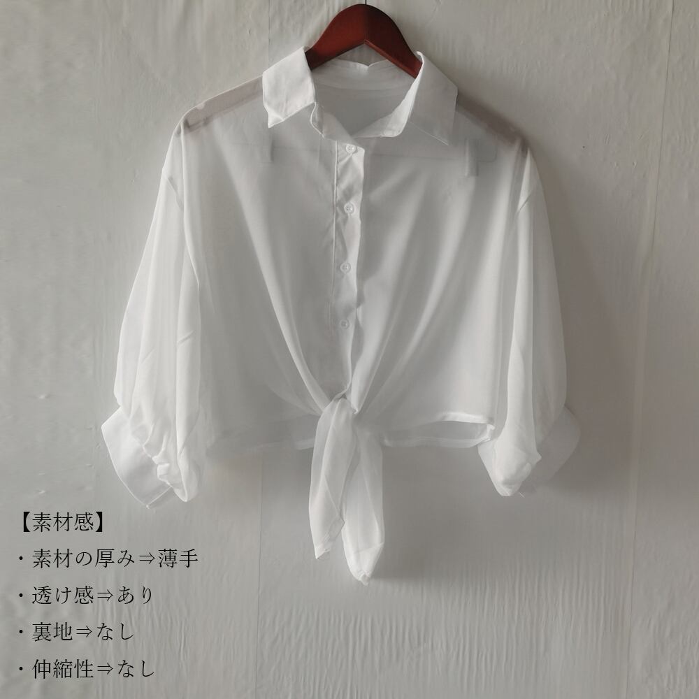 女性らしい裾リボン結びシアーシャツブラウス