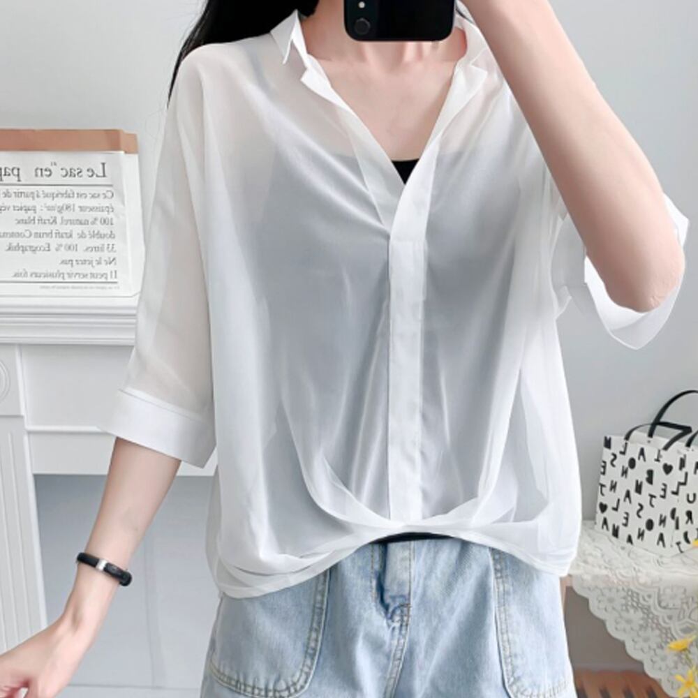 スキッパーブラウスシャツ キャミソー付き セットアップ 透け感 大人 シースルー トップス きれいめ