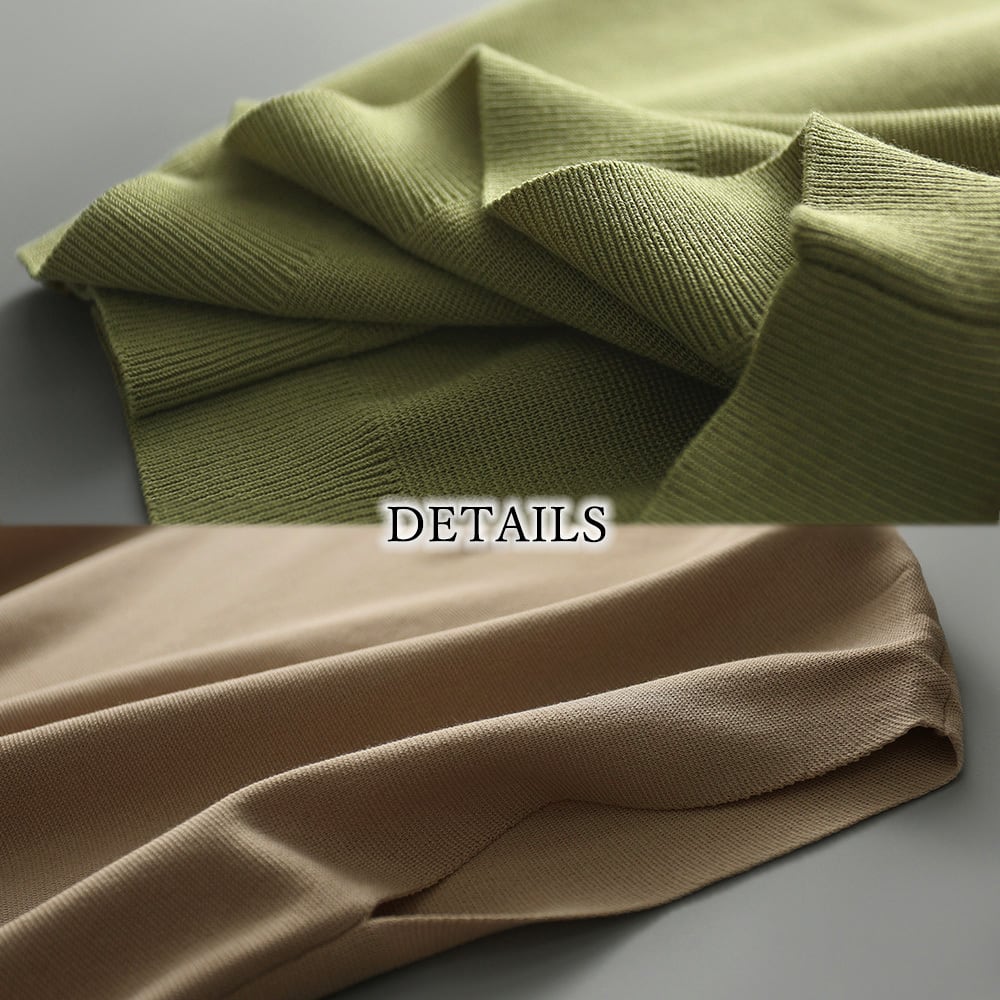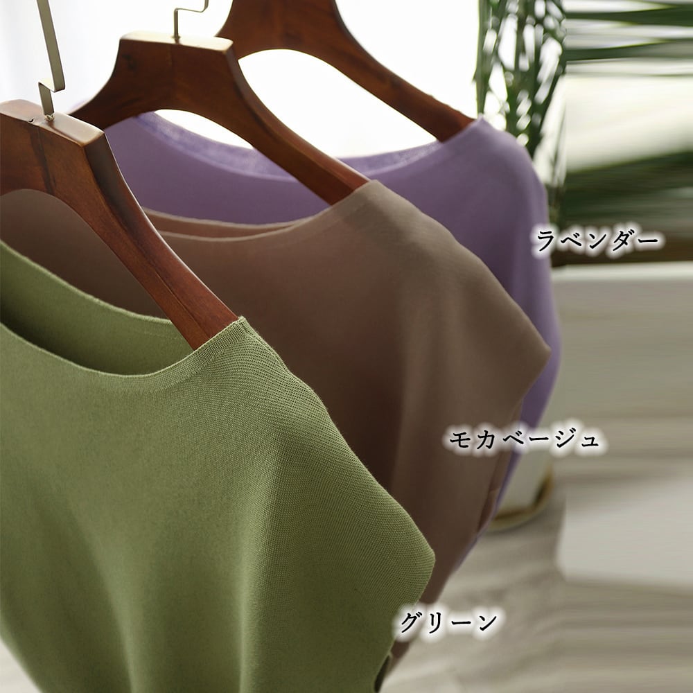 レーヨンのしっとりとした質感に微弾力のある素材感、お肌に優しく吸いつくような着心地のニットトップス