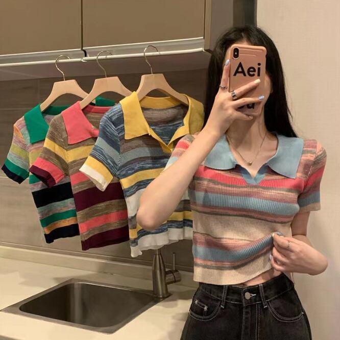 ボーダー柄 レインボー ニット トップス 襟付き ショート ショート丈