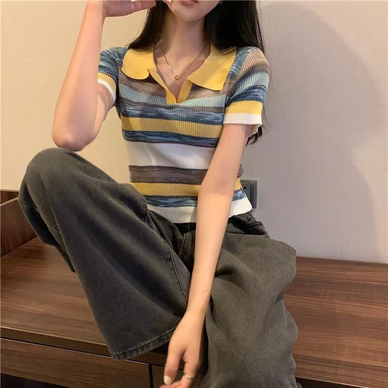 レインボーストライプのニッチデザインで、夏のカジュアルスタイルを抜群 ボーダ柄半袖ニット