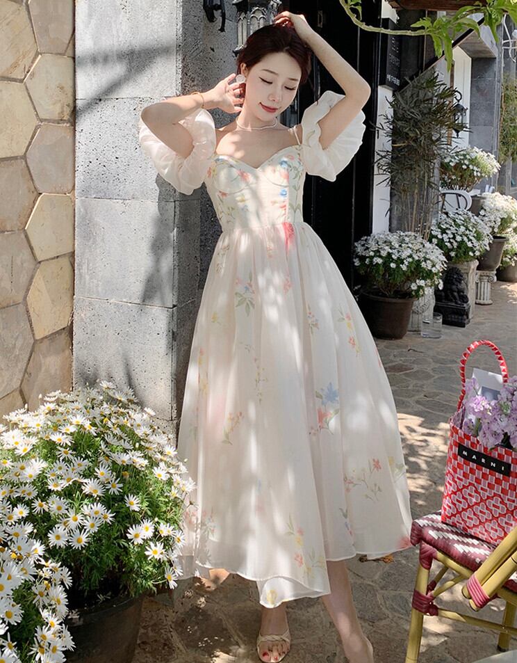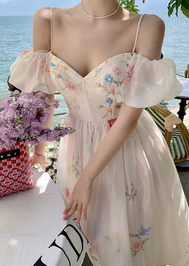 花柄ワンピース オフショルダー パフスリーブ キャミソールワンピース フレアワンピース ロングワンピ