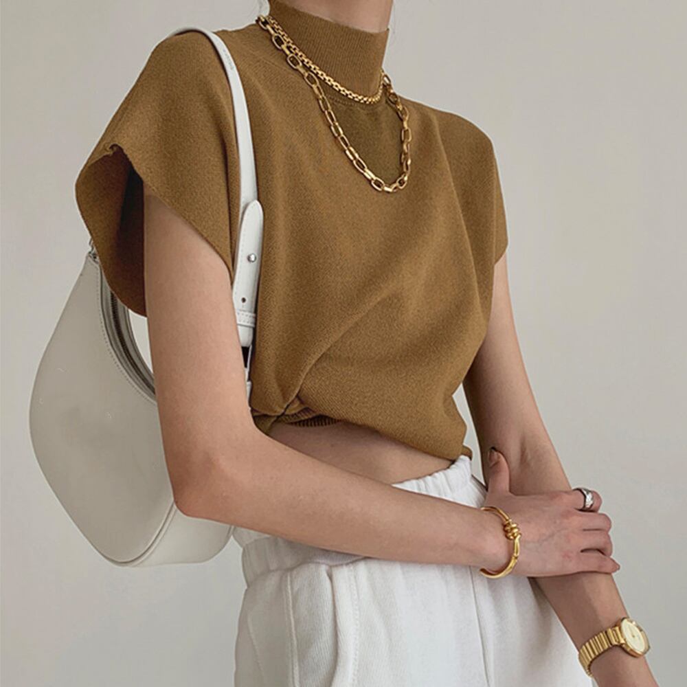 ニット トップス ハイネック ニットソー 無地 フレンチスリーブ 韓国ファッション 春秋 夏服
