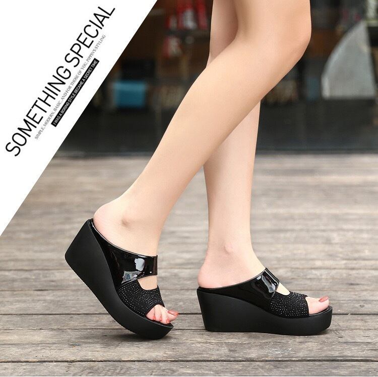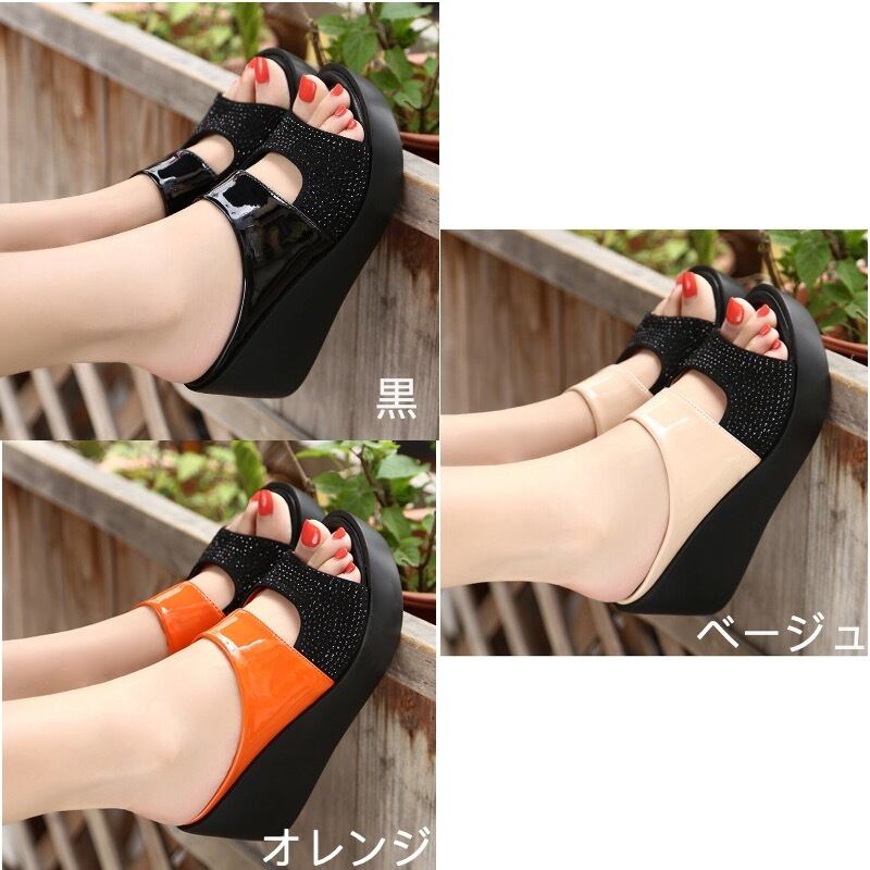 約7.5cmのウエッジソールで安定感があって、履くだけで美脚効果のある厚底サンダルがお目見え~