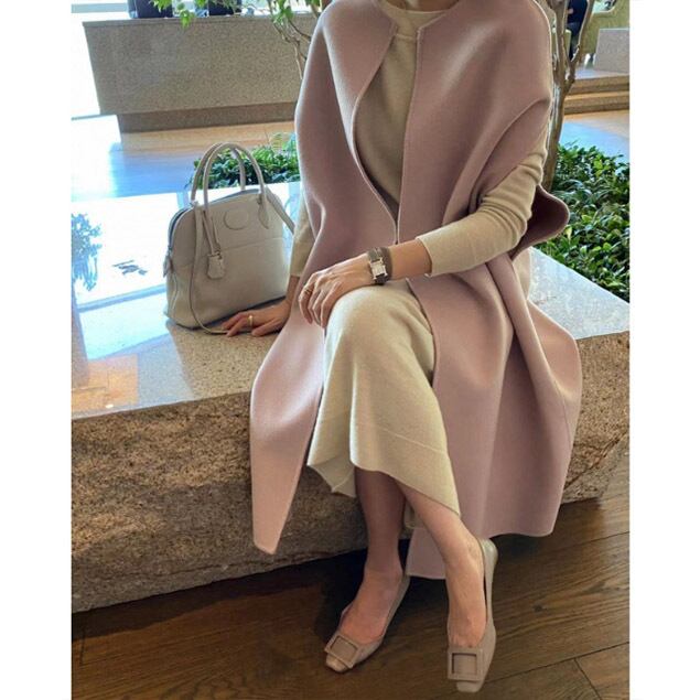 ・ノーカラーなので、トップスにタートルネックを合わせたスタイリングもオススメです。