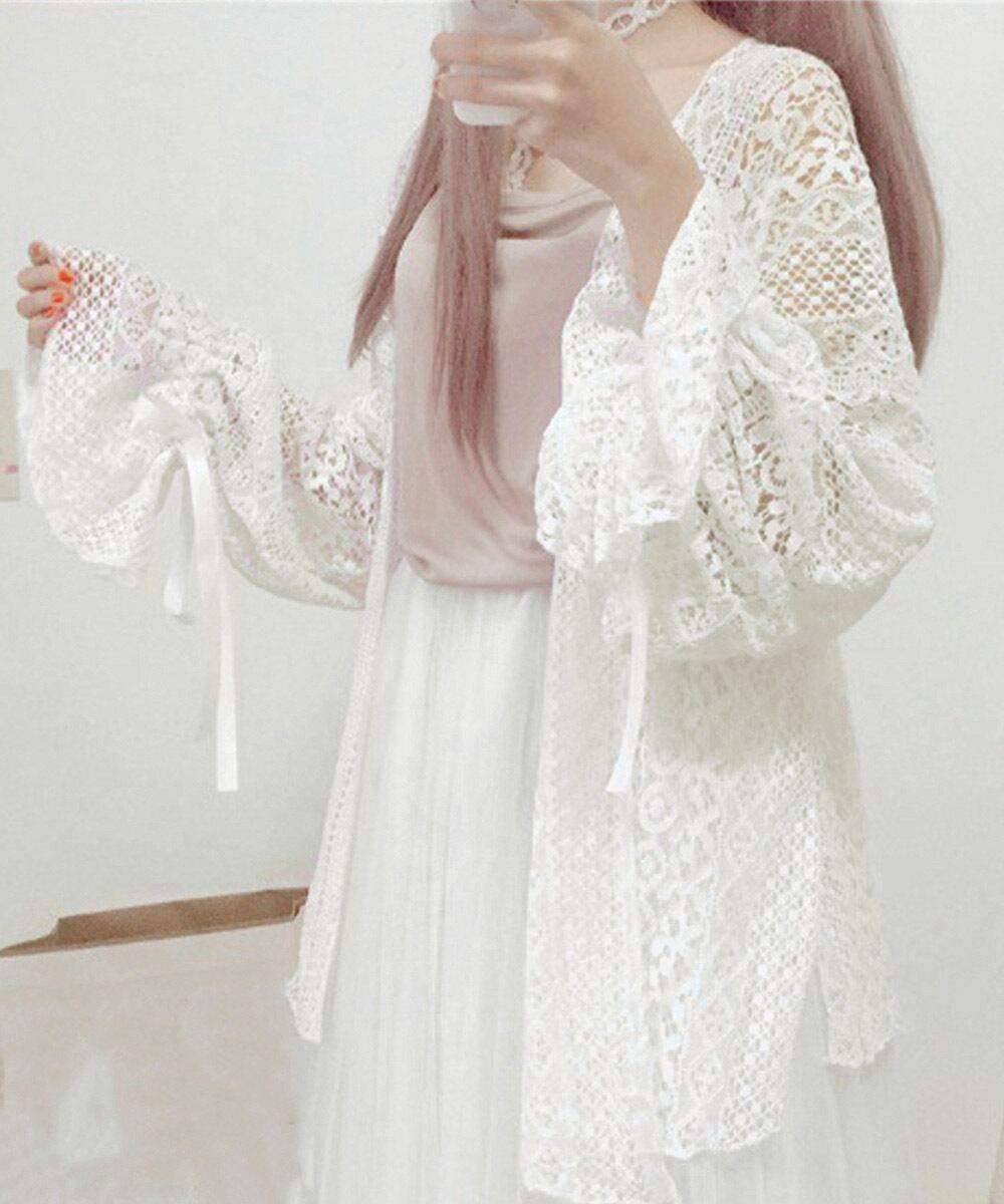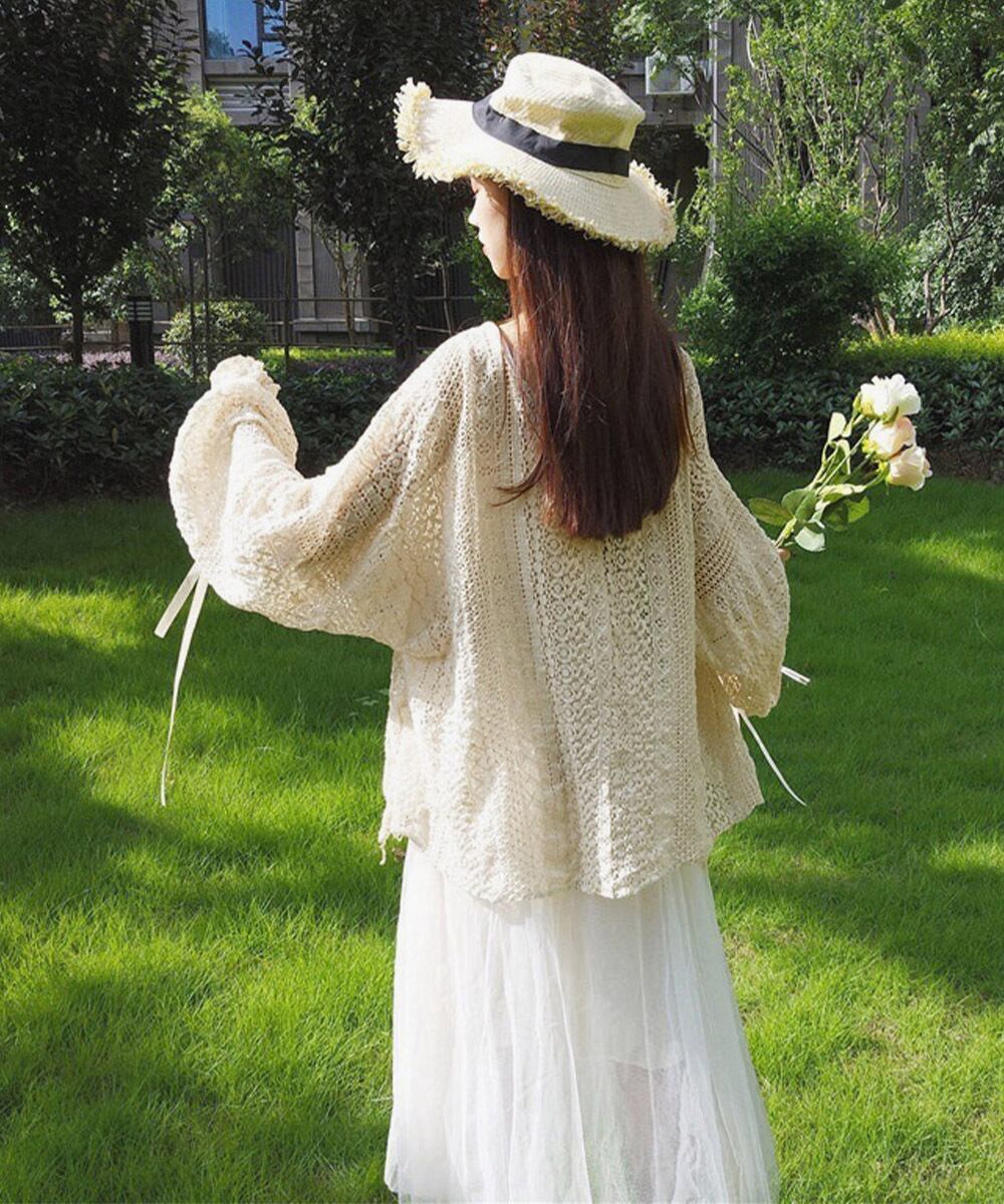 【日本倉庫即納】 透かし編み レースカーディガン リボン袖