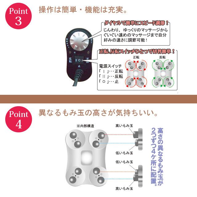 スイッチで正転・反転が切替でき、ダイヤルでスピード調整(じんわり、ゆっくりのマッサージから、ぐいぐい速めのマッサージまで)自分好みの速さに調整ができます。