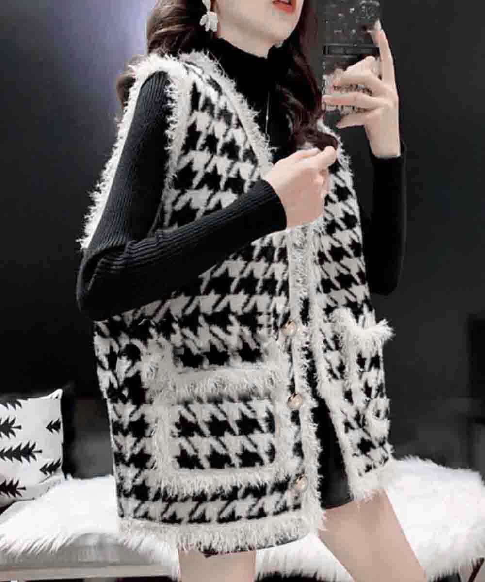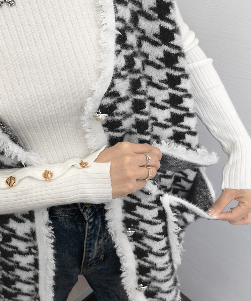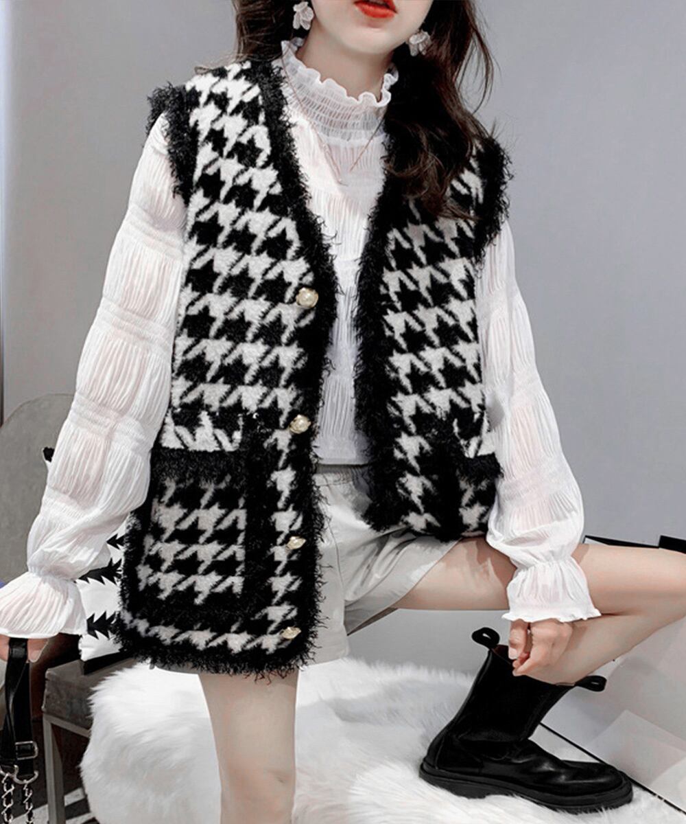 モノトーンの千鳥格子柄が、大人っぽさと上品さを演出し、幅広いスタイルに合わせやすいファッションベスト