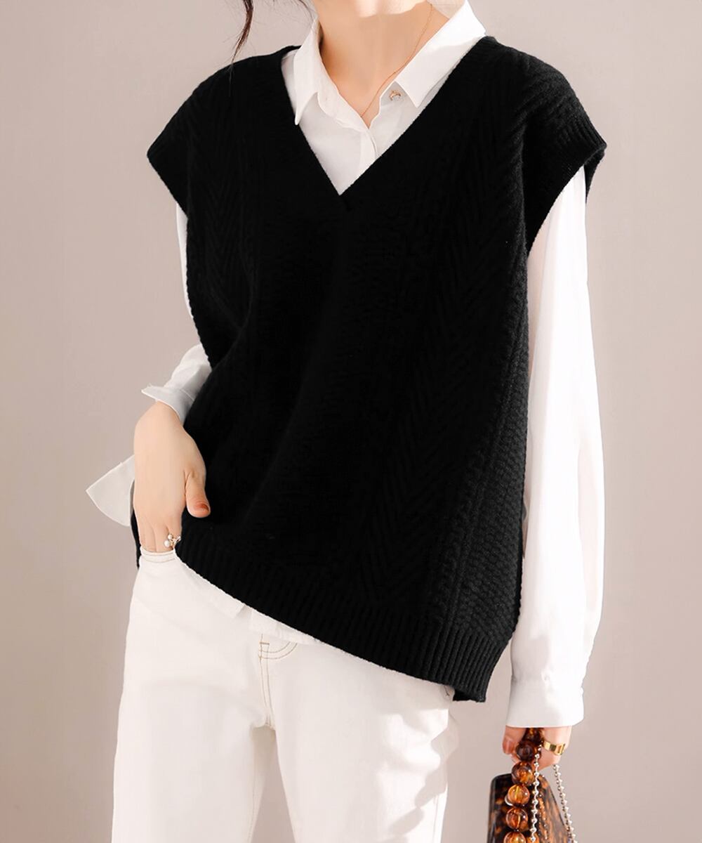ケーブル編みデザインがアクセントになり、シンプルなコーディネートでも存在感を発揮するニットベスト。