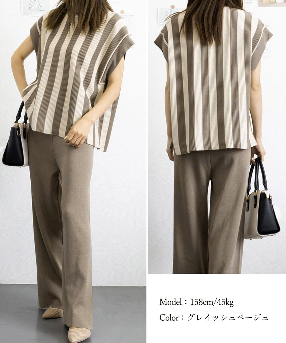 半袖ストライプニット フレンチスリーブトップス ニットワイドパンツ 上下2点セットオフィスカジュアル 20代30代40代