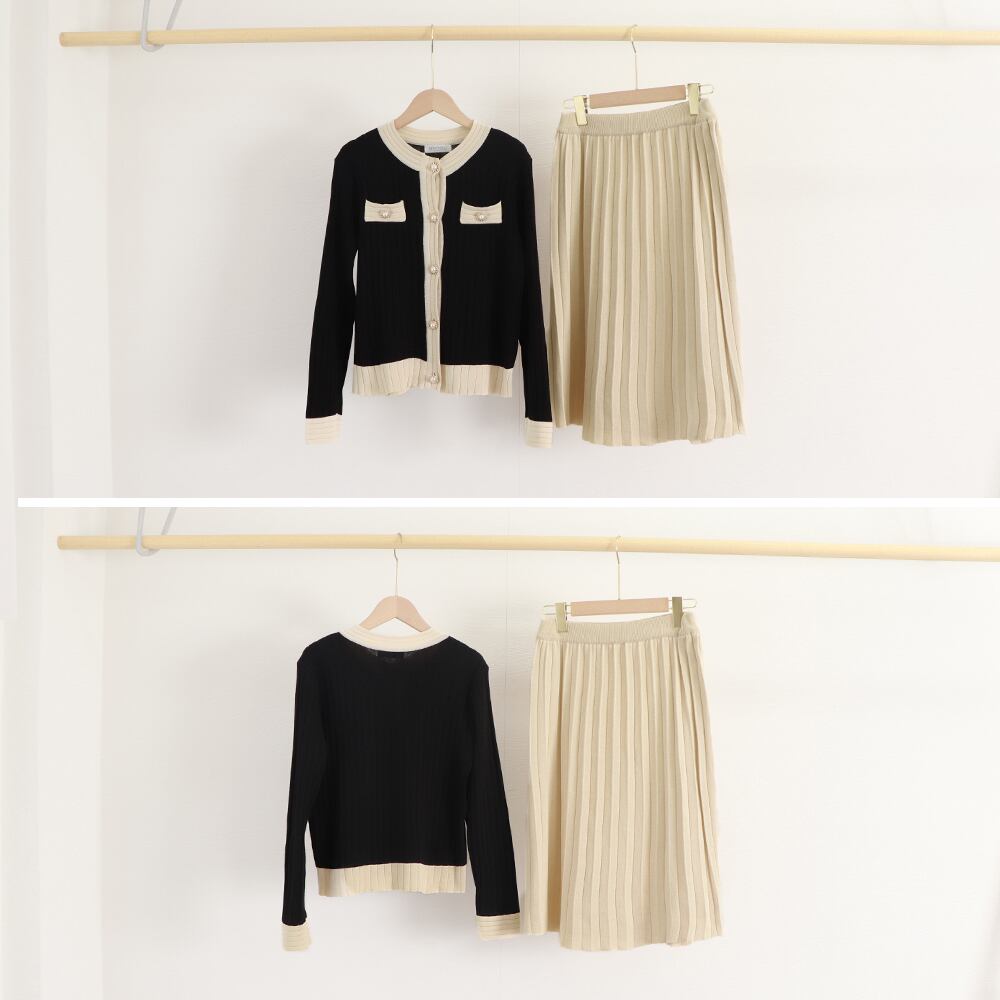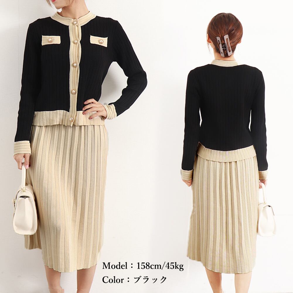 ニットアンサンブル レトロバイカラー ニットカーディガン ハイウエスト ニットプリーツスカート きれいめツーピースセット
