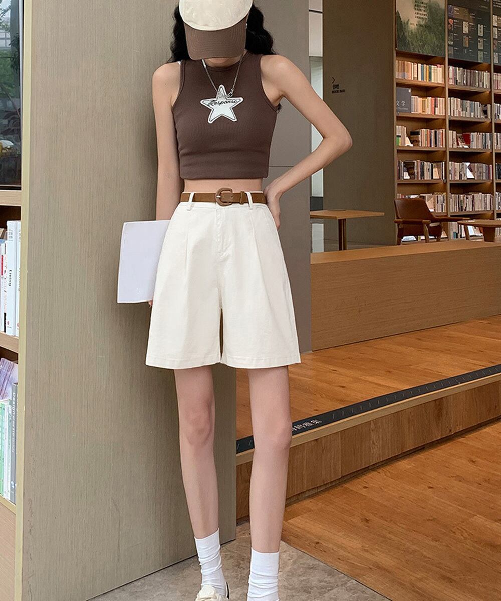 ベルト付きでコーデのアクセントになる、ハイウエストのタックショートパンツ。