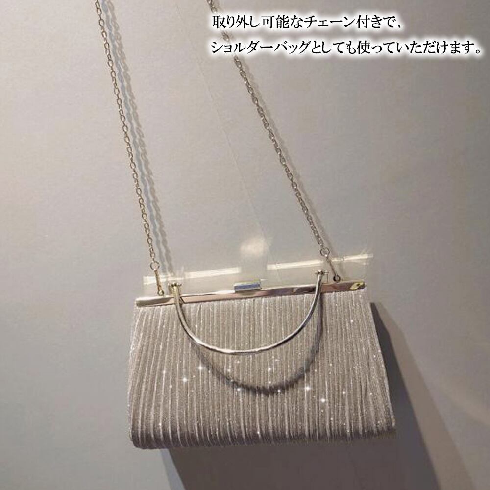 華やかなラメ生地にプリーツ加工を施し、上品さをプラスした3wayがま口パーティーバッグです