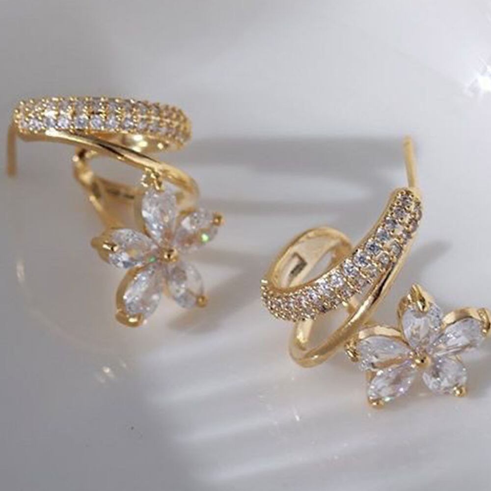 キラキラ輝くラインストーンに大振りの花モチーフのフェミニンピアス