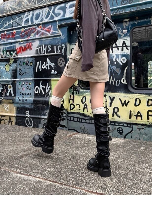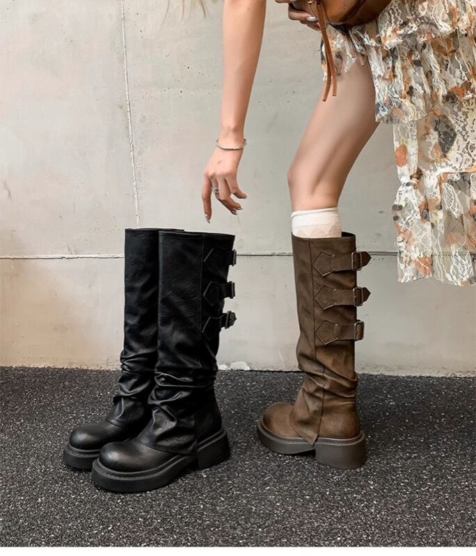 廃墟風ヴィンテージ感ある厚底ロングブーツ 大きめシルエットのパンツインOK シワ加工