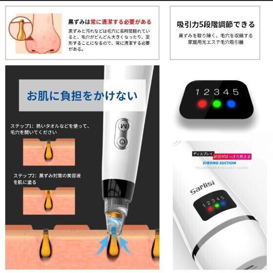 3色フォトンライト、真空吸引の機能を搭載して、5つの吸引ヘッドが付き、黒ずみ、余分皮脂など皮膚問題を改善可能です。