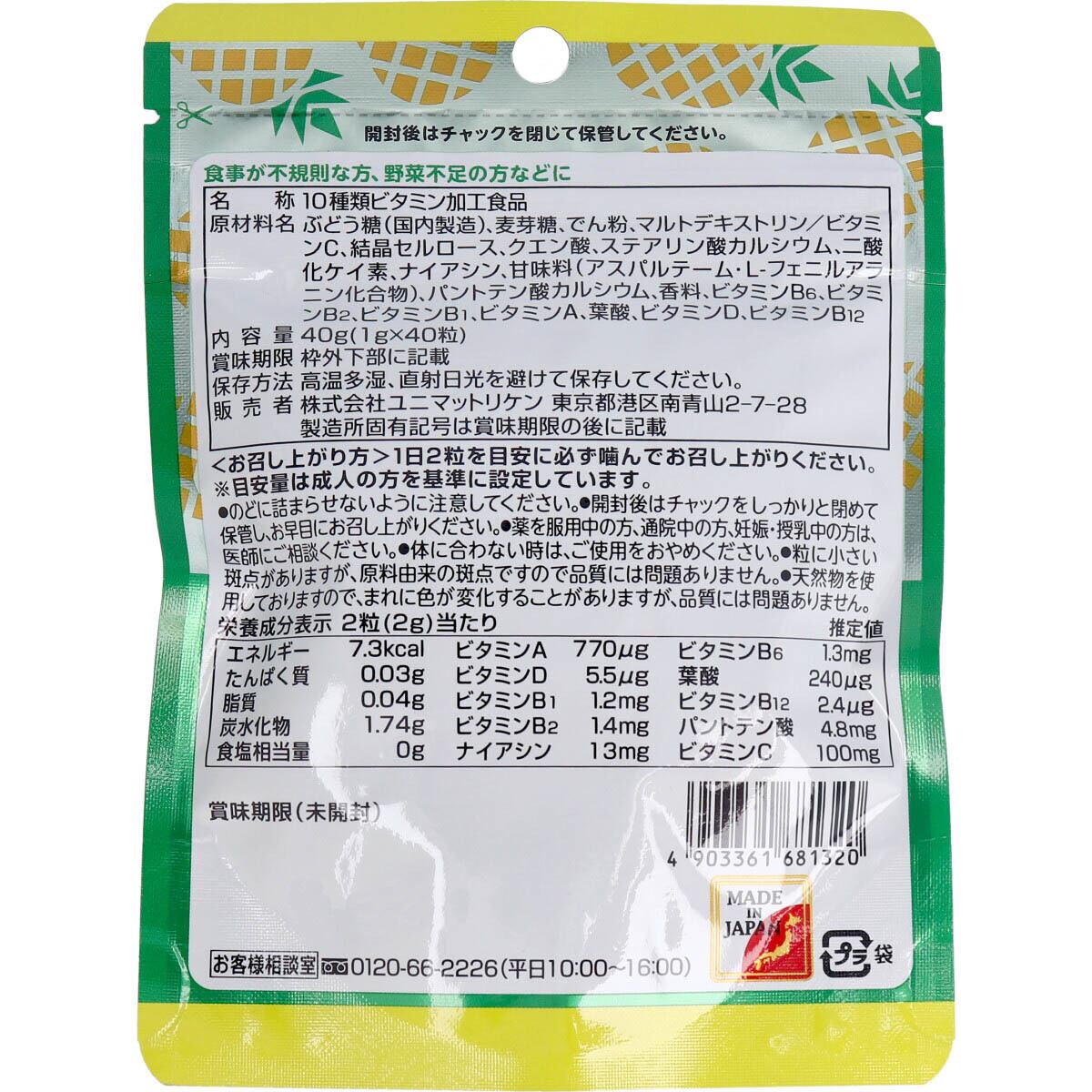 2粒で10種類のビタミンが摂取出来るパイナップル風味のタブレットです。