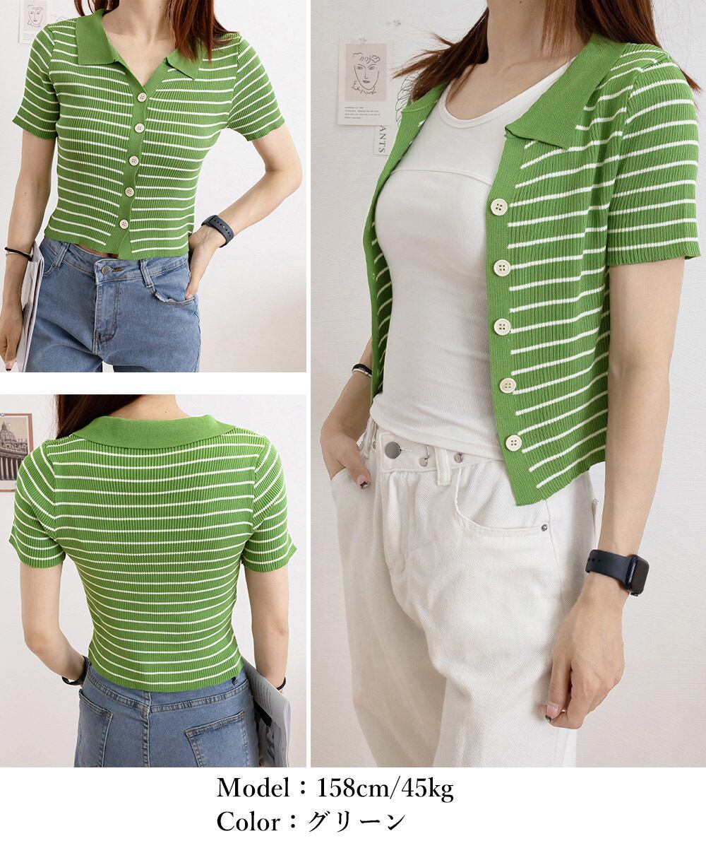 【日本倉庫即納】 ボーダー柄ニットポロシャツレディース半袖