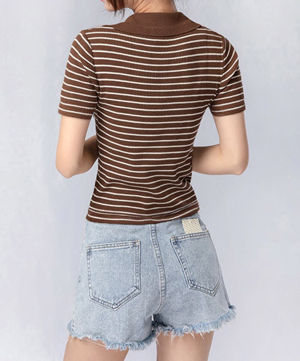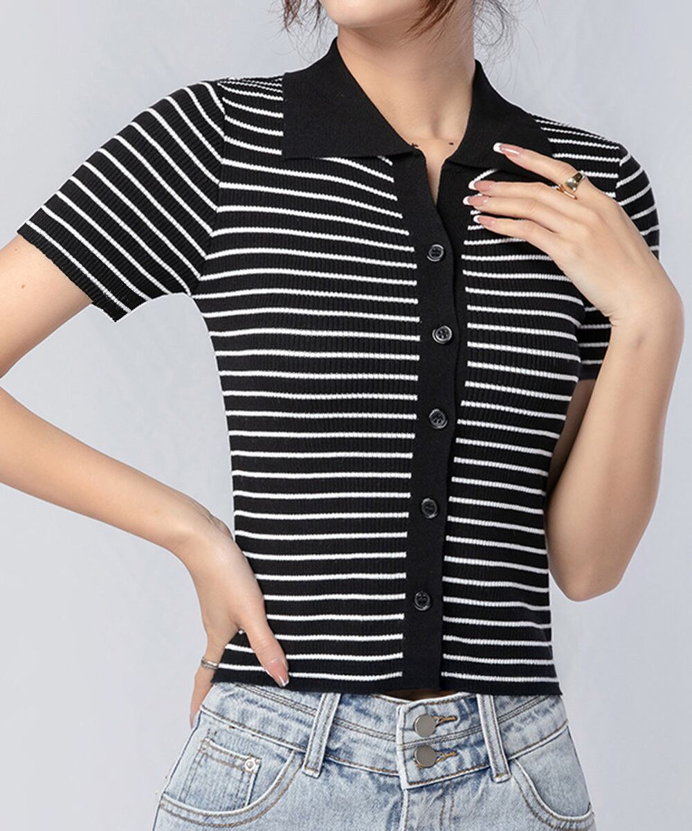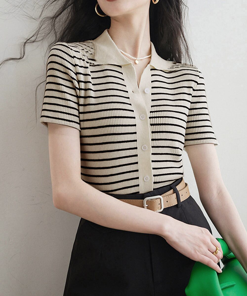 クラシックな襟付きボーダーニットポロシャツ。
