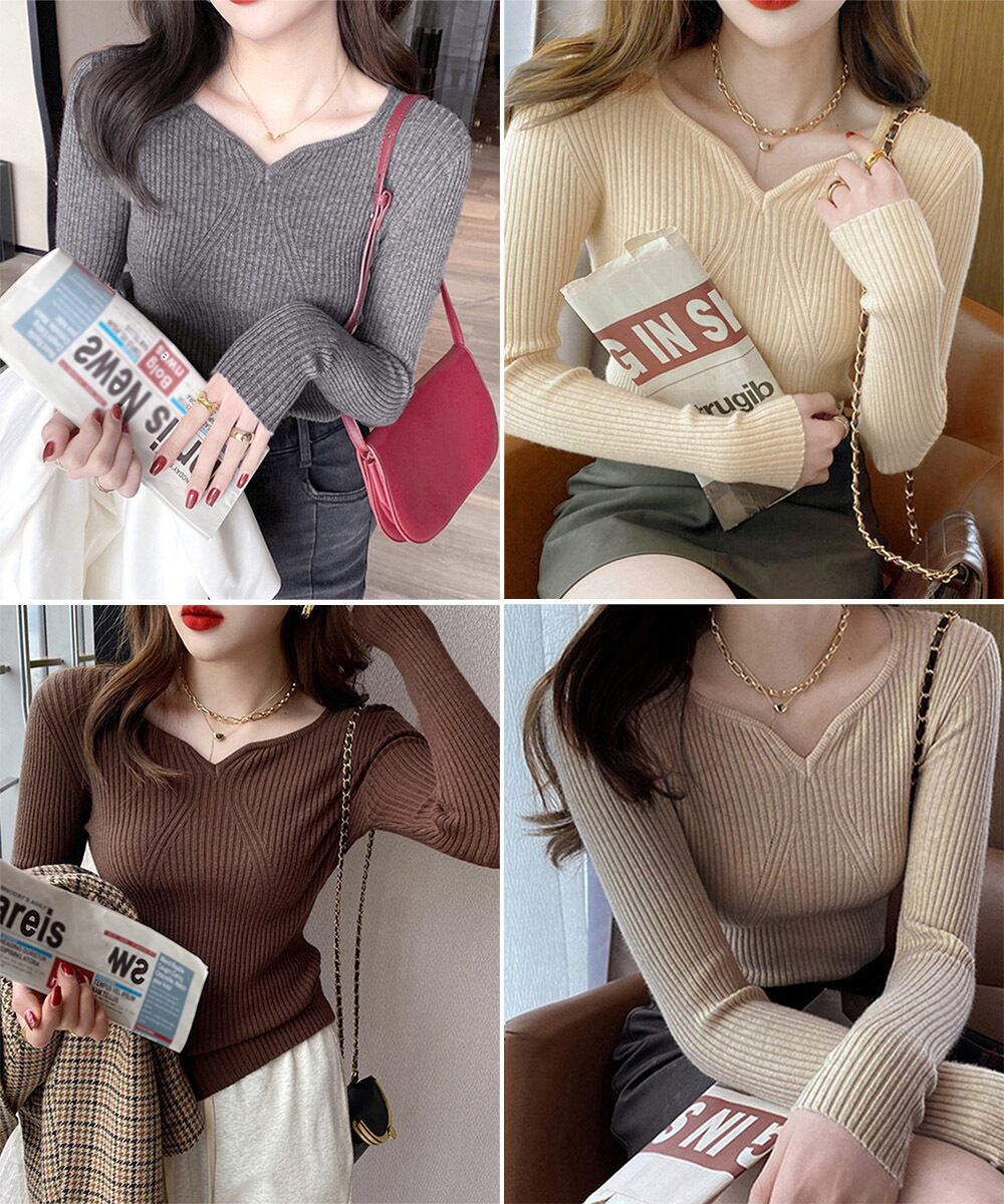 ハートネックで首元がすっきり綺麗に見える長袖タイトニットトップス