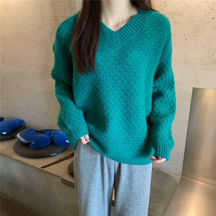 韓国ファッション 女性 レトロ 暖かさ ニットトップス Vネック ピュアカラー セーター
