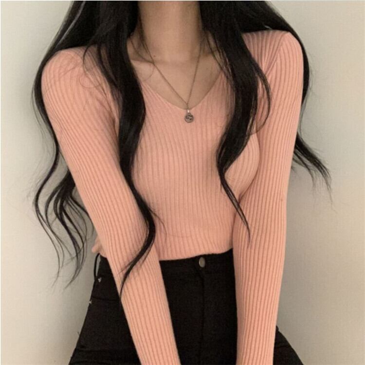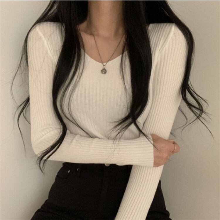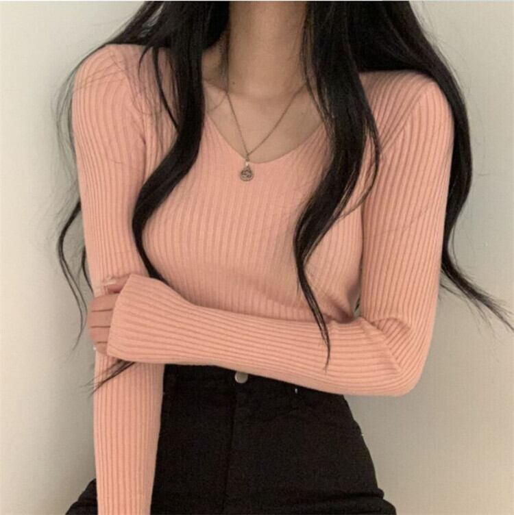 ヤングスタイル 韓国 秋 レトロ Vネック ベースシャツ ニットトップス ピュアカラー