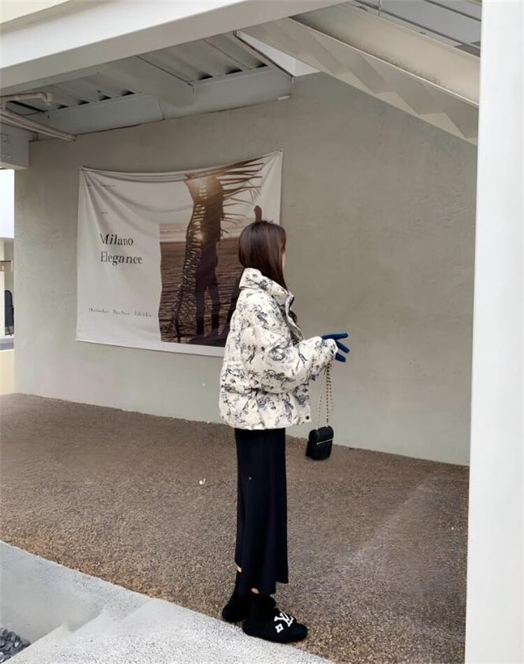 ダウンコットン 短外套 ルーズフィット 通勤向け 柄生地 厚手 暖房効果
