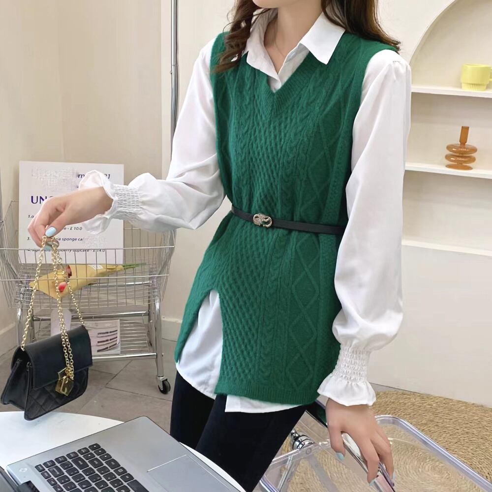 襟付きシャツ 長袖/ニットチョッキ/春秋冬 重ね着