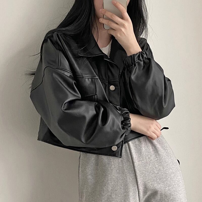 襟付きPUレザージャケット ダブルポケット付き ゆったりシルエットの短めアウター