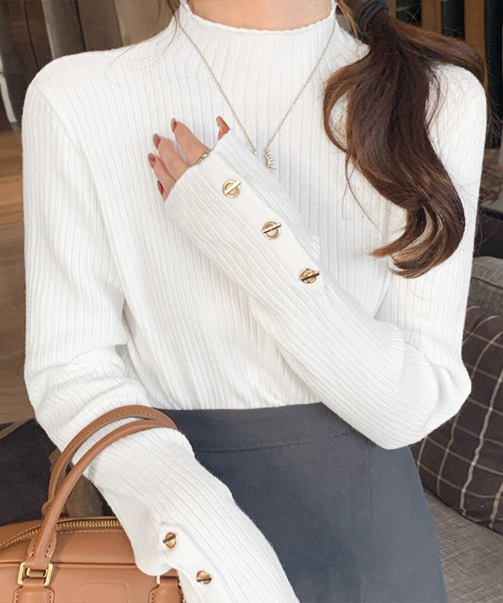 韓国風 大人きれいめ ニットセーター 無地 ニットインナー 袖ボタンニットカットソー オフィスカジュアル チクチクしない