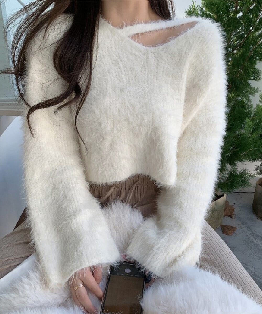 ふわふわ ショート丈ニットトップス アシメトリーネック モヘアニットプルオーバー 秋冬シャギーセーター セクシー 韓国風