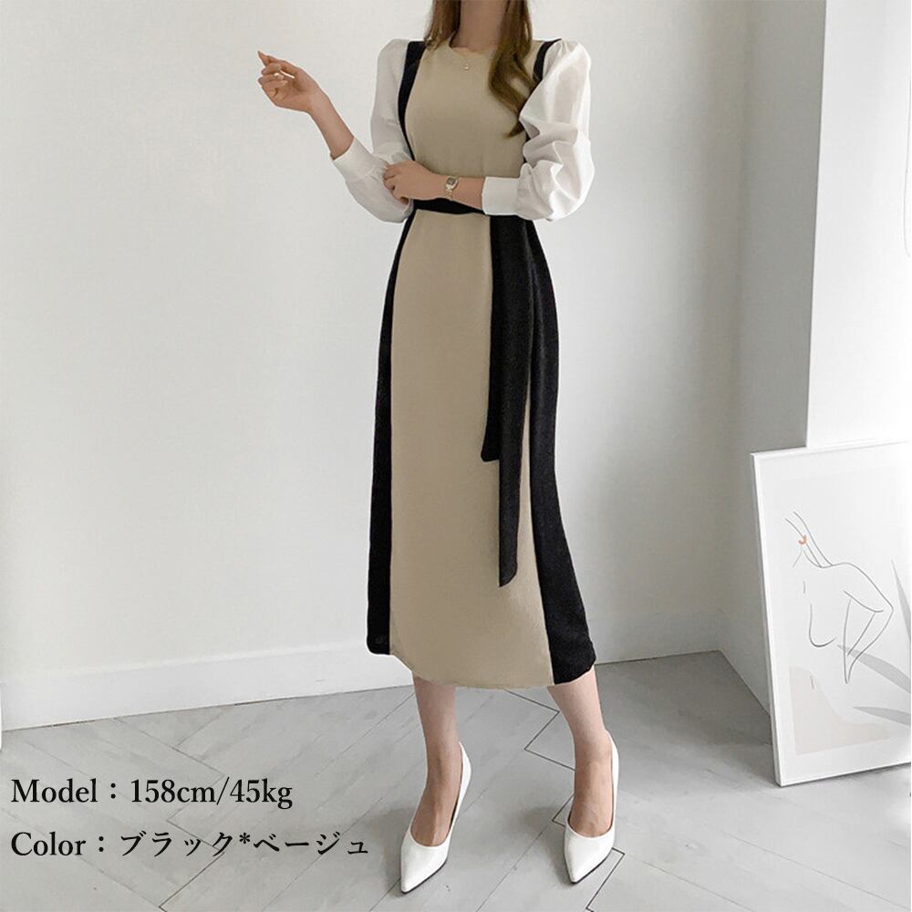 レディース オシャレ カットソーワンピース バイカラー ウエストマーク 長袖ワンピ パフスリーブ フェミニン レトロ風