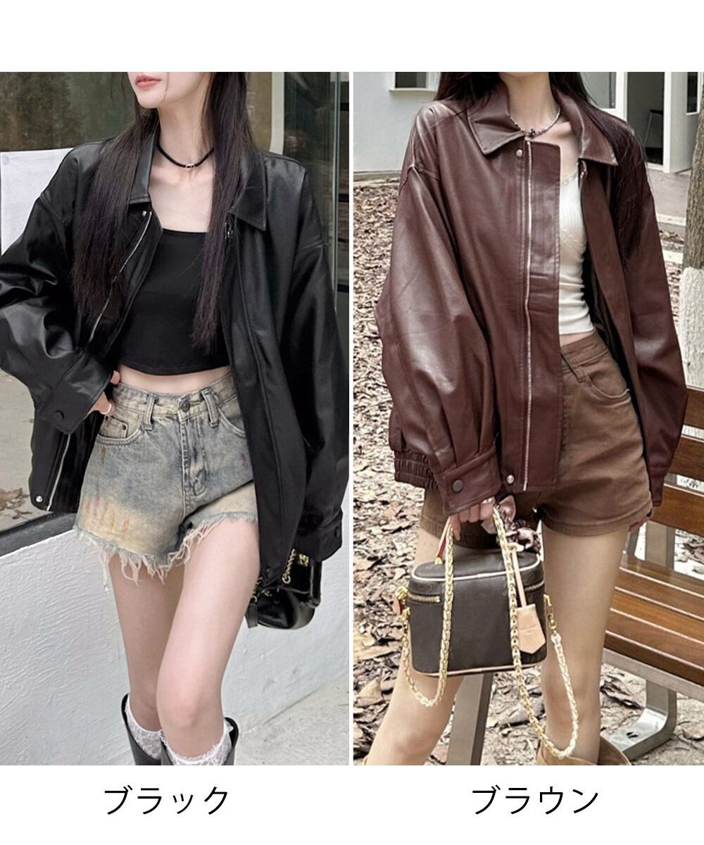 トレンド感たっぷりのレディースドロップショルダージップアップPUレザージャケット。