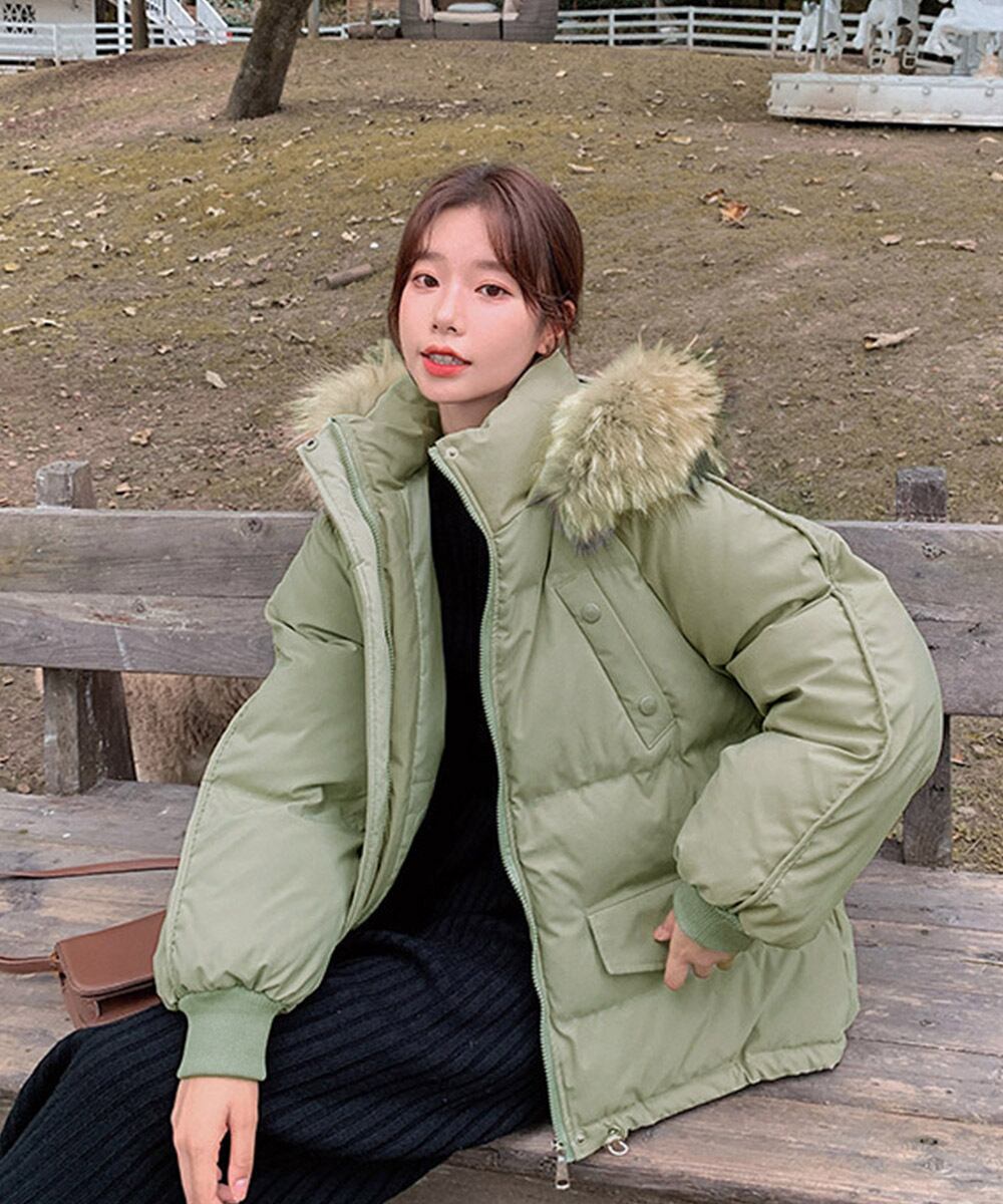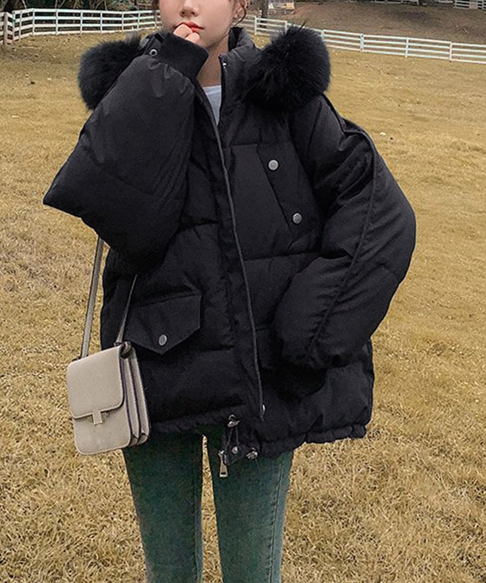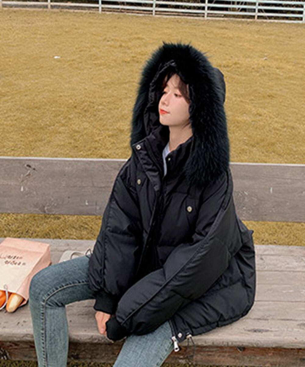 フェイクダウン冬服/ウィンターコート黒/フードファーお洒落