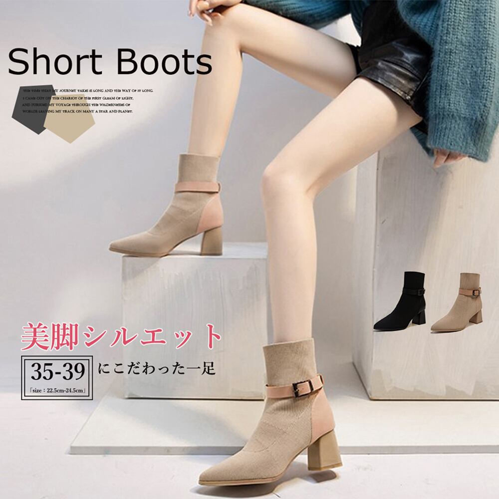 おしゃれ ソックス風 ストレッチブーツ ポインテッドトゥ ハーフブーツ 履きやすい チャンキーヒール ブーティ 痛くない