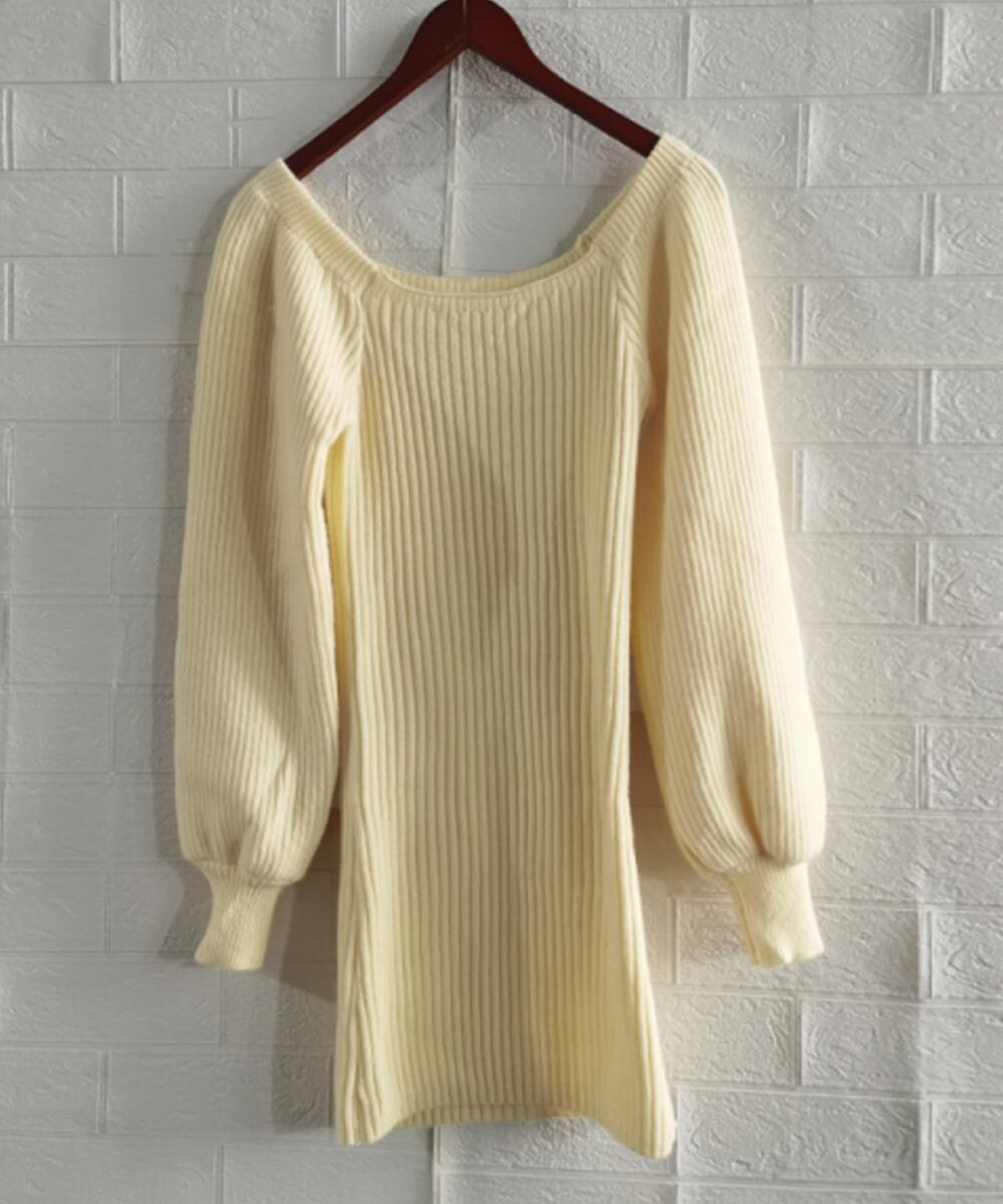 スクエアネックなのでデコルテ部分をスッキリと見せてくれるショート丈ニットワンピース。