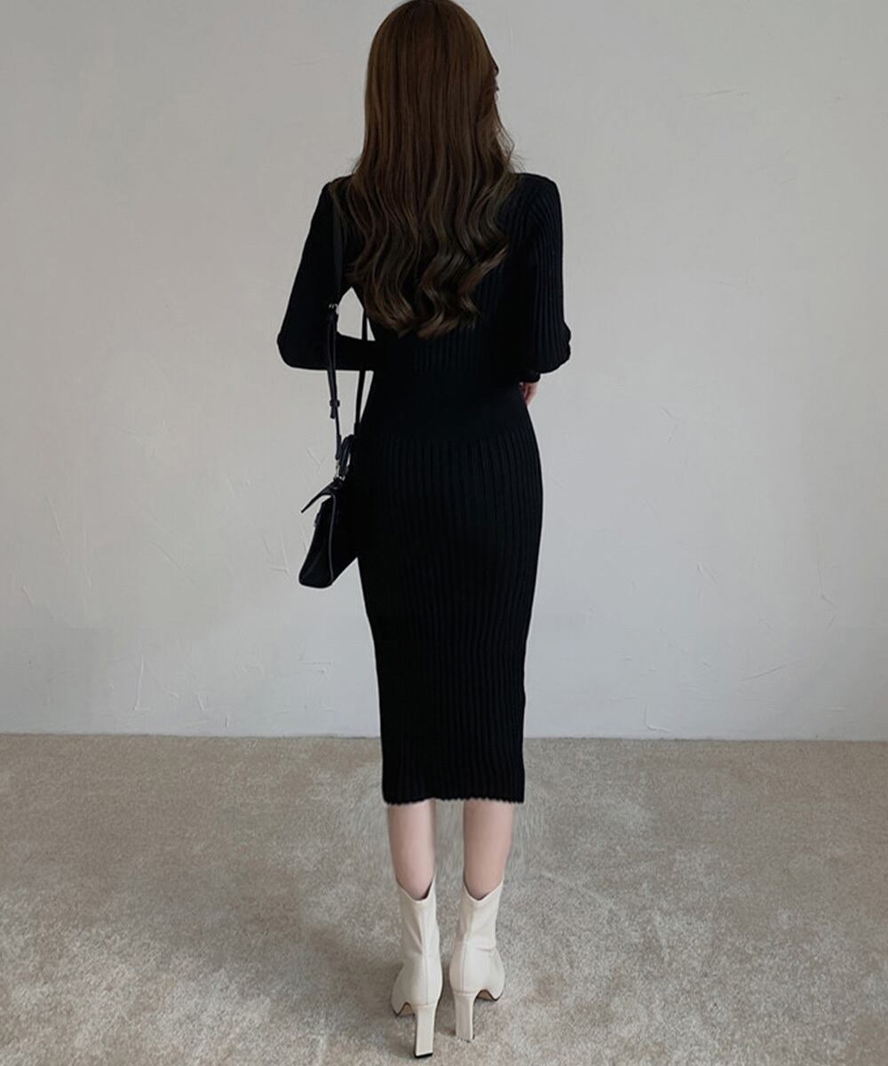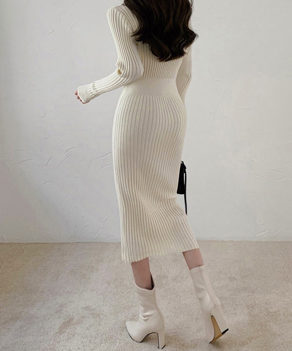 エレガントなタイトシルエットを引き立てるリブニットワンピース。