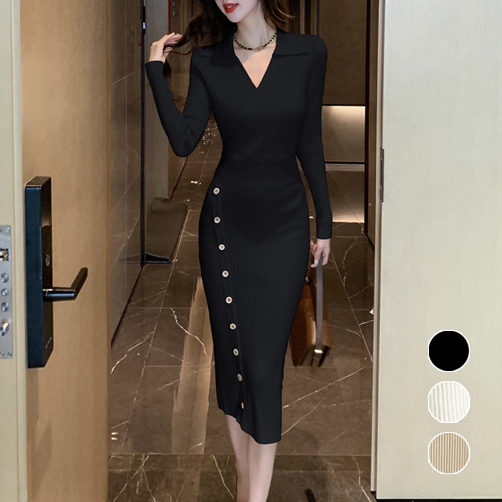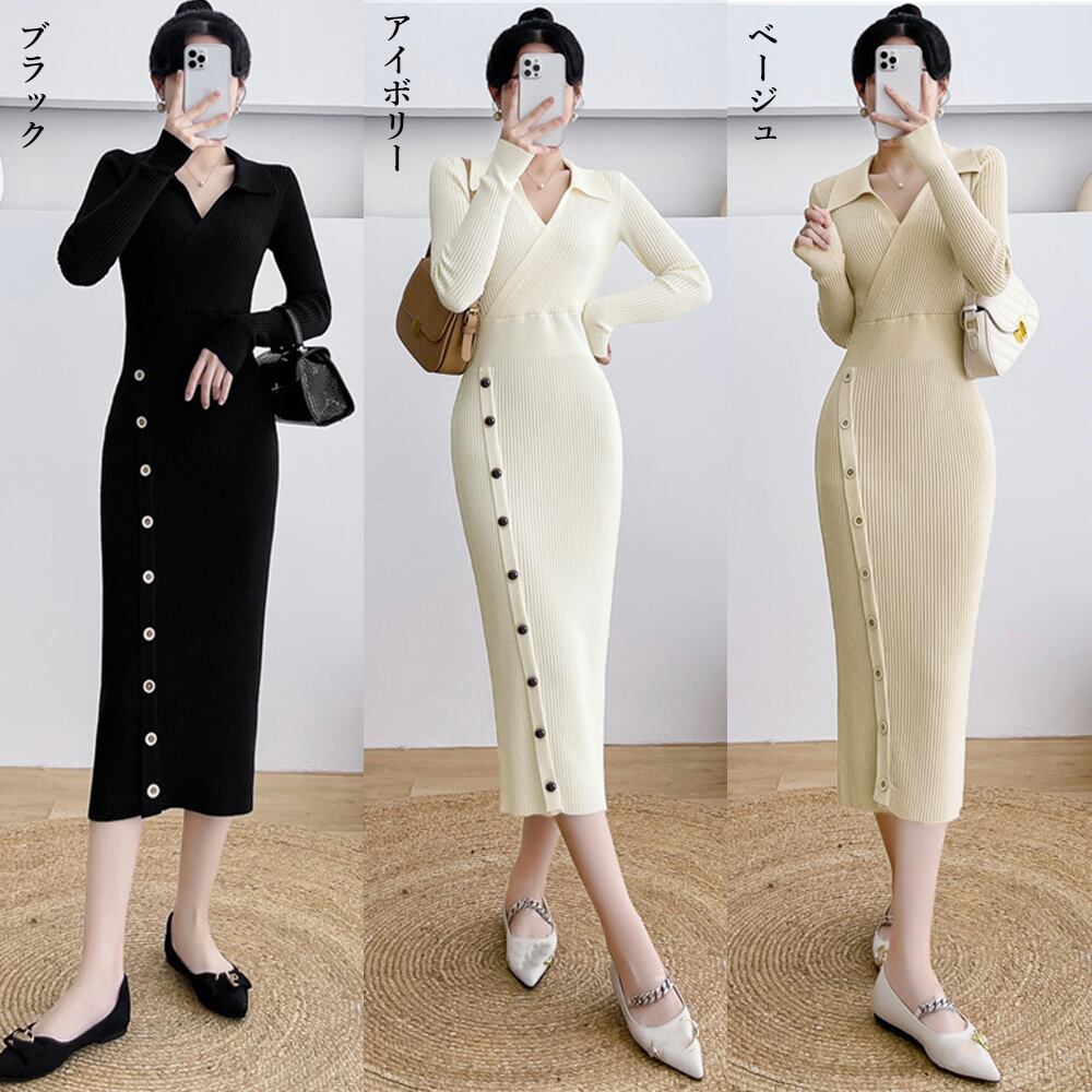 韓国ファッション ミディ丈ワンピース セクシーリブニット きれいめタイトワンピースVネック ボディコンワンピース 着やせ