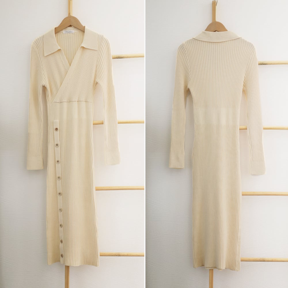 カシュクールネックがオトナ女子のお色気を演出しながら、膝まで隠れる上品な丈感でエレガントな淑女風の装いになる韓国DESIGNの新作リブ編みニットワンピース